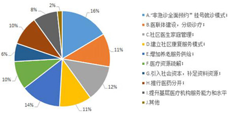 調查結果顯示,占比前三位的依次是:“非急診全面預約”掛號就診模式(16%)、增加養(yǎng)老服務供給(14%)及社區(qū)醫(yī)生家庭管理(12%)。此外,“醫(yī)聯體建設及分級診療”“建立社區(qū)康復服務模式”“醫(yī)療資源疏解”和“推行醫(yī)藥分開”等醫(yī)改措施同樣受到網民關注,占比均達到10%以上。分析認為,從網民關注內容可以反映出,預約就診模式、增加養(yǎng)老服務供給等醫(yī)改措施得到較多網民認可。