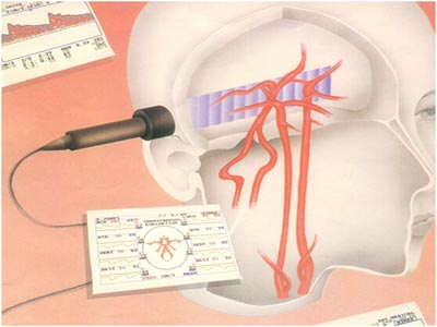 利用2MHz的低發(fā)射頻率與脈沖多普勒技術結(jié)合,通過顱骨特定的聲窗, 獲得顱底主要動脈生理及病理的血流動力學參數(shù)的無創(chuàng)性腦血管檢測方法。